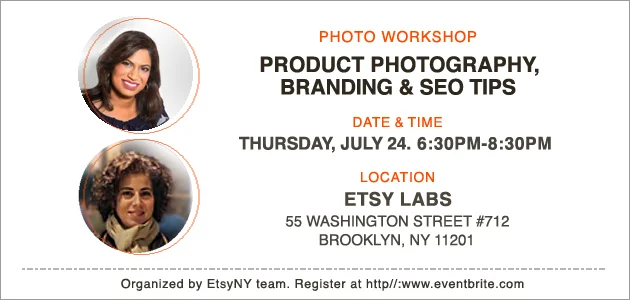 Join Elena Ruano Kanidinc of SimplyNu and Rekha Krishnamurthi of DivineNYCo and the Etsy New York team on Thursday, July 24, 2014 between 6:30 and 8:30 PM at the Etsy Labs in Dumbo, NY (Brooklyn) for a workshop on using photography to define your brand.