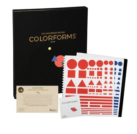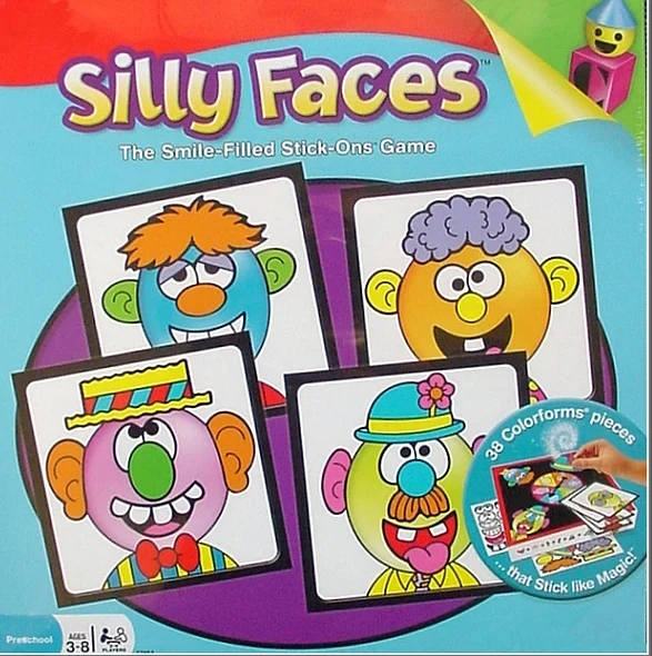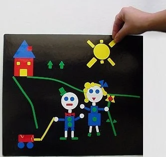 Colorforms are paper-thin, die-cut vinyl sheet images and shapes that are meant to be applied to a shiny plastic laminated board, much like placing paper dolls against a paper backdrop. The images stick to the background by adhesion, which takes place when two highly polished surfaces come in contact. The Colorforms vinyl pieces can be repositioned to create new designs and scenarios.