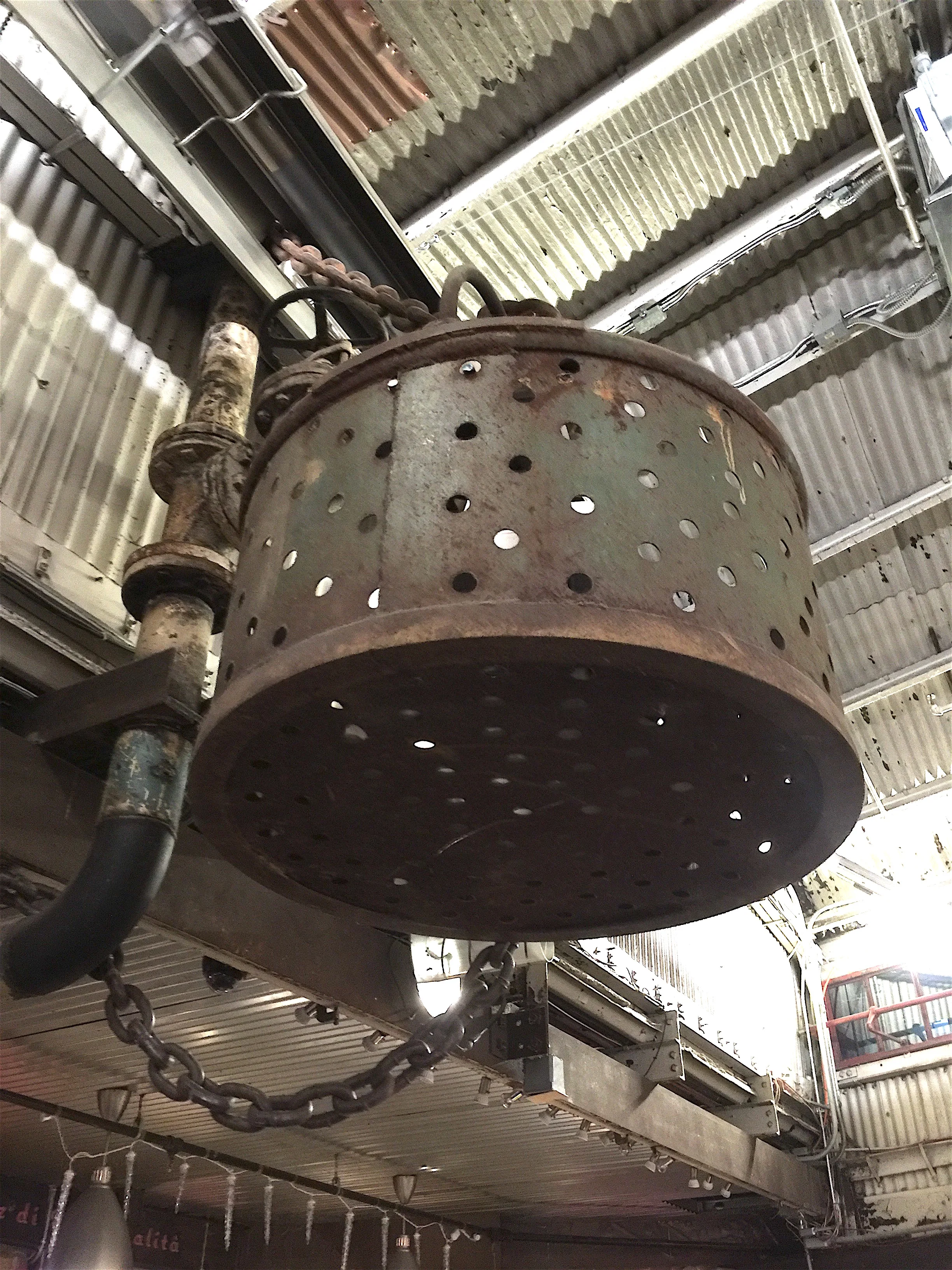 Fans of recycled industrial salvage will be delighted by how the remains of the factory’s industrial past have been repurposed: the unique fountain of old drill bits, the elevators framed in shiny brass lockboxes, the hammered copper walls, and assorted pipes which lend a steampunk feel to the atmosphere of the market. Be sure to take notice of these unique spots inside the market on your next visit!