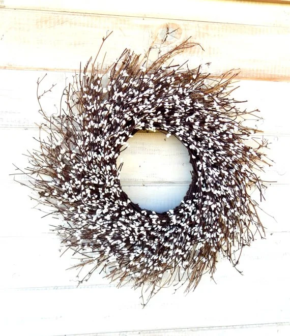 Keeping with the vintage feel, this sunburst twig wreath with artificial white pip berries from Wild Ridge Design makes perfect wedding décor. Whether it’s hanging on a wall or placed flat in the center of the table to frame a candle centerpiece it’s simply stunning.